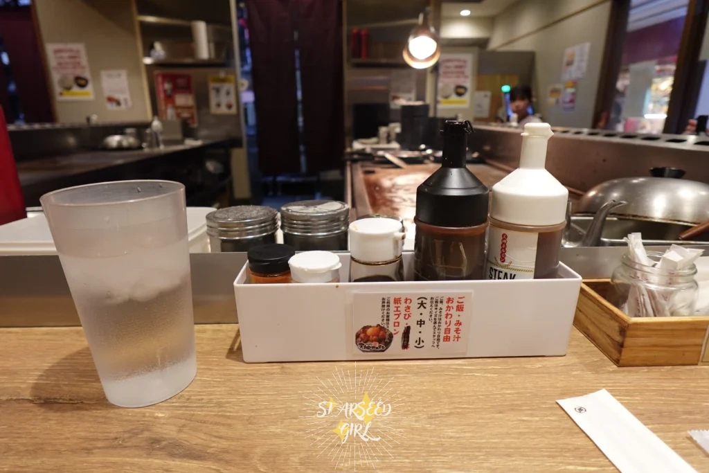 每個座位都有額外提供醬料,有牛排醬、味增醬、醬油、玫瑰鹽及辣粉